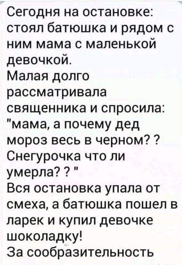 Сегодня на остановке стоял батюшка и рядом с ним мама с маленькой девочкой Малая долго рассматривала священника и спросила мама а почему дед мороз весь в черном Снегурочка что ли умерла Вся остановка упала от смеха а батюшка пошел в ларек и купил девочке шоколадку За сообразительность