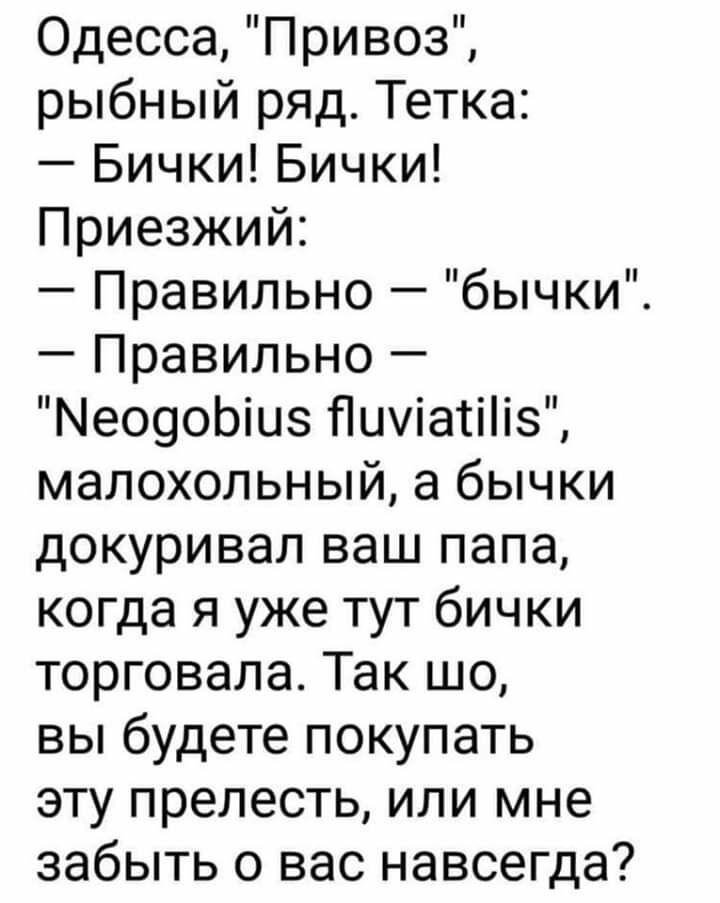 Одесса Привоз рыбный ряд Тетка Бички Бички Приезжий Правильно бычки Правильно Ме09оЬіиз Пиуіатіііз малохольный а бычки докуривал ваш папа когда я уже тут бички торговала Так шо вы будете покупать эту прелесть или мне забыть о вас навсегда