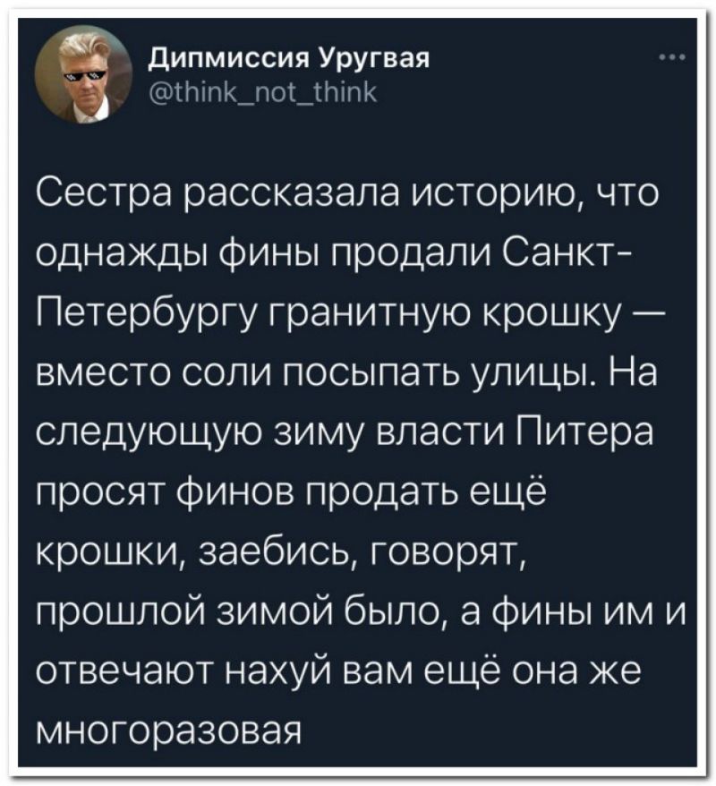 Дипмиссия Уругвая ННПК_ПОЁ_ЁЫПК Сестра рассказала историю что однажды фины продали Санкт Петербургу гранитную крошку вместо соли посыпать улицы На следующую зиму власти Питера просят Финов продать ещё крошки заебись говорят прошлой зимой было а фины им и отвечают нахуй вам ещё она же многоразовая