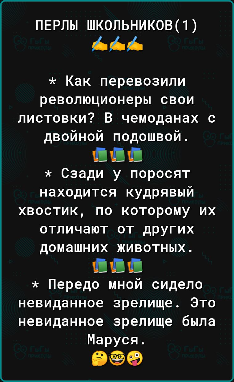 перлы школьниковп ААА Как перевозили революционеры свои листовки В чемоданах с двойной подошвой ШШШ Сзади у поросят находится кудрявый хвостик по которому их отличают от других домашних животных ШМ Передо мной сидело невиданное зрелище Это невиданное зрелище была Маруся ВЁЭФ