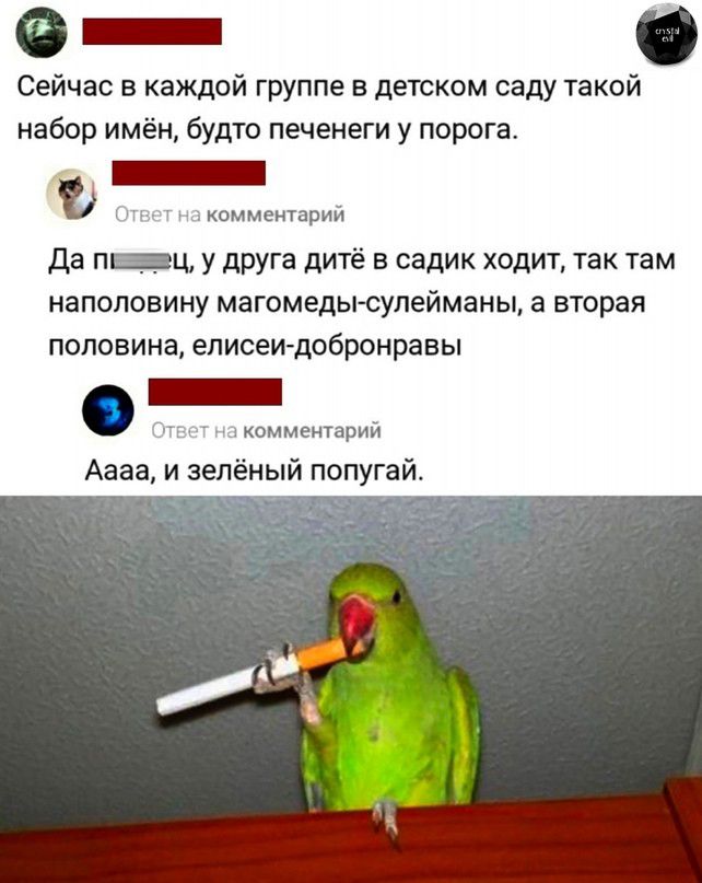 _ Сейчас в каждой группе в детском саду такой будто Печенеги у порога комментами _ Ц У друга дитё в садик ходит так там наполовину магомедысупейманы а вторая половина ЕПИСЕИДОБРОНРЗЕЫ _ камменты Аааа и зелёный попугай