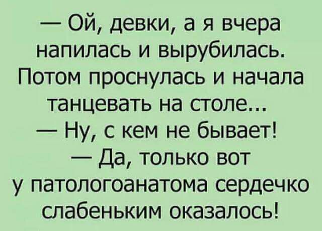 Ой девки а я вчера напилась и вырубилась Потом проснулась и начала танцевать на столе Ну с кем не бывает Да только вот у патопогоанатома сердечко слабеньким оказалось