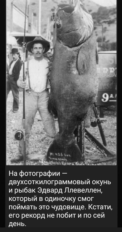 двухсоткилограммовый окунь и рыбак Эдвард Ллевеллен который в одиночку смог поймать это чудовище Кстати его рекорд не побит и по сей день