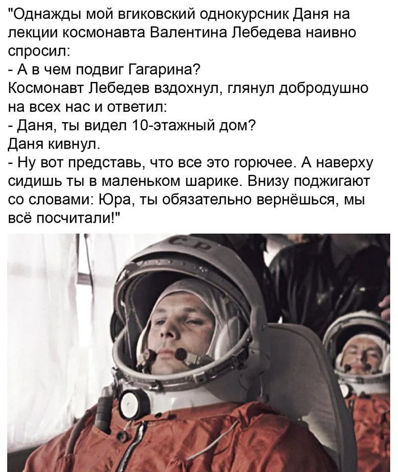 Однажды мой вгиковский однокурсник даня на лекции космонавта Валентина Лебедева наивно спросил А в чем подвиг Гагарина Космонавт Лебедев вздохнул глянул добродушно на всех нас и ответил Даня ты видел 1Оэтажный дом Даня кивнул Ну вот представь что все это горючее А наверху сидишь ты в маленьком шарике Внизу поджигают со словами Юра ты обязательно вернёшься мы всё посчитали
