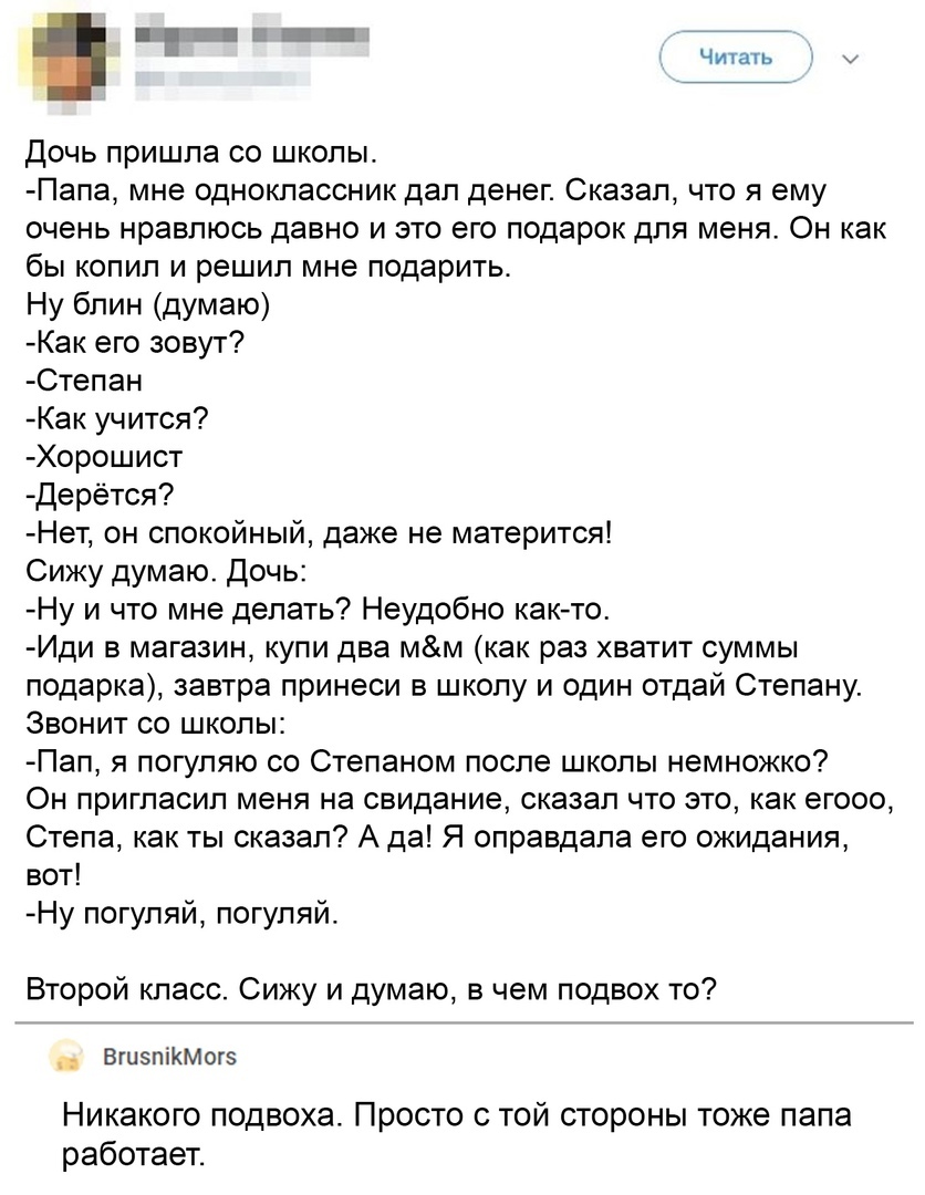 Е _Д 7 а Дочь пришла со школы Папа мне одноклассник дал денег Сказал что я ему очень нравлюсь давно и это его подарок для меня Он как бы копил и решил мне подарить Ну блин думаю Как его зовут Степан Как учится Хорошист Дерётся Нет он спокойный даже не матерится Сижу думаю Дочь Ну и что мне делать Неудобно както Иди в магазин купи два мм как раз хватит суммы подарка завтра принеси в школу и один от