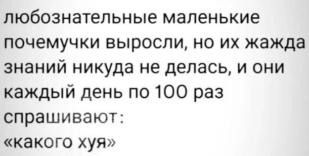 любознательные маленькие почемучки выросли но их жажда знаний никуда не делась и они каждый день по 100 раз спрашивают какого хуя