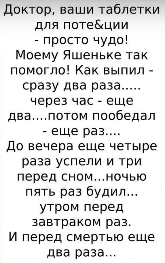 Доктор, ваши таблеточки для поте&ции - просто чудо! Моему Яшенке так помогло! Как выпил - сразу два раза...... через час - еще два....потом пообедал - еще раз.... До вечера еще четыре раза успели и три перед сном...ночью пять раз будил... утром перед завтраком раз. И перед смертью еще два раза...