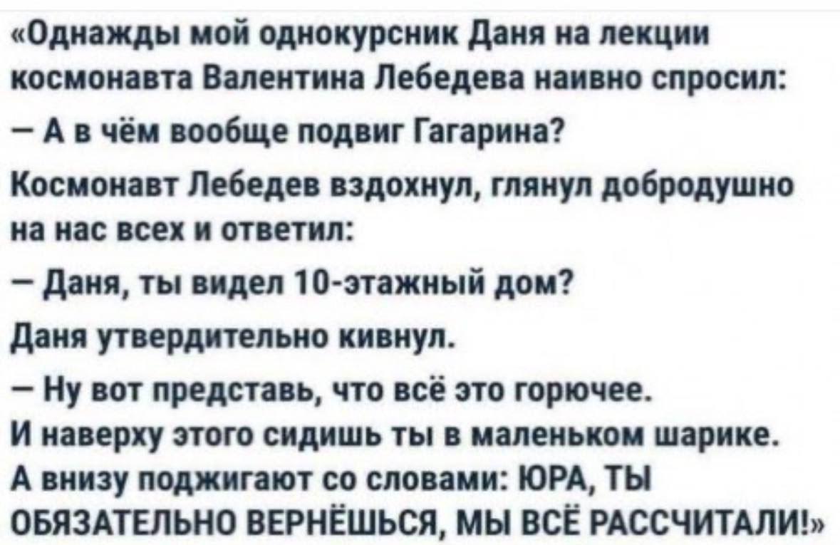 «Однажды мой однокурсник Даня на лекции космонавта Валентина Лебедева наивно спросил: - А в чем вообще подвиг Гагарина? Космонавт Лебедев вздохнул, глянув добродушно на нас всех и ответил: - Даня, ты видел 10-этажный дом? Даня уверительно кивнул. - Ну вот представь, что всё это горяче. И наверху этого сидишь ты в маленьком шарике. А внизу поджидает со словами: ИЮРА, ТЫ ОБЯЗАТЕЛЬНО ВЕРНЕШЬСЯ, МЫ ВСЁ РАССЧИТАЛИ! »