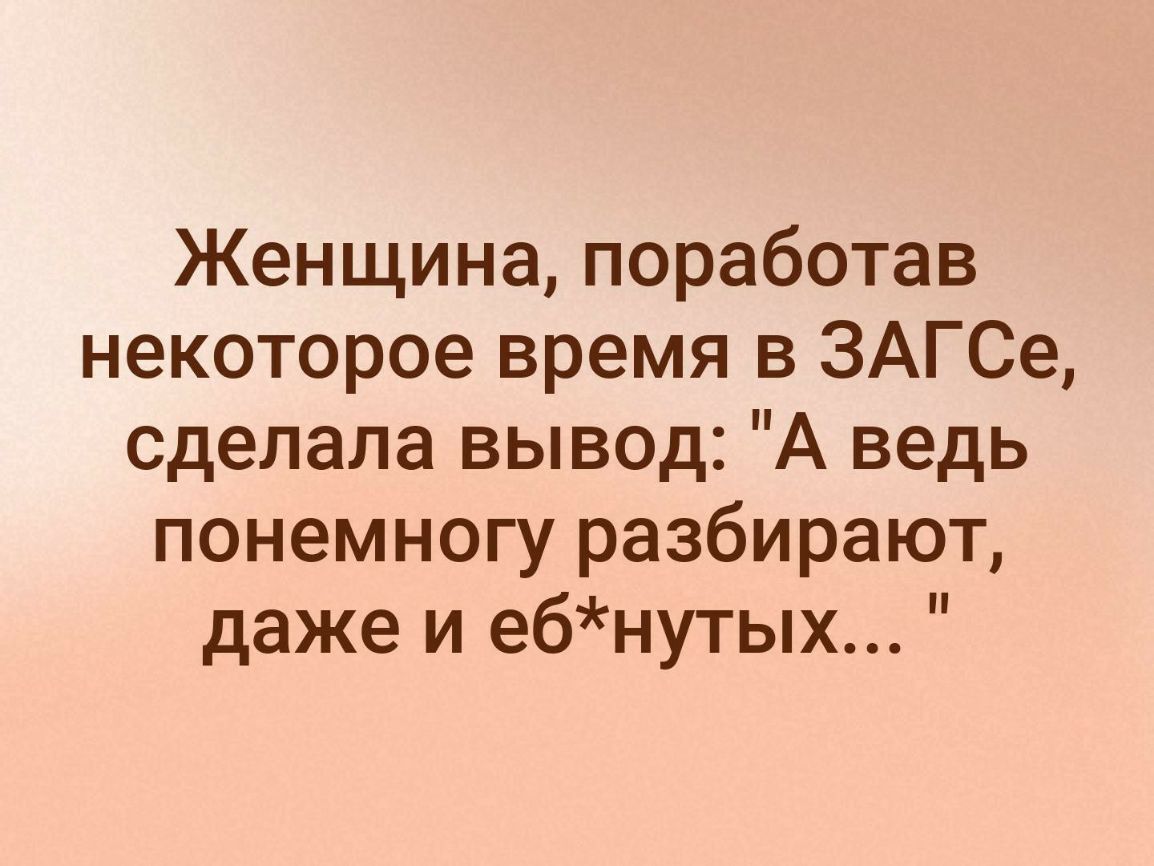 Женщина поработав некоторое время в ЗАГСе сделала вывод А ведь понемногу разбирают даже и ебнутых