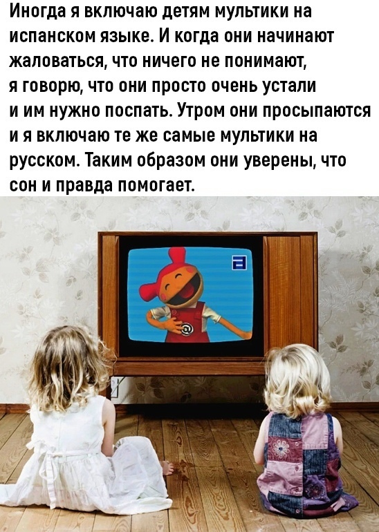 Иногда я включаю детям мультики на испанском языке И когда они начинают жаловаться что ничего не понимают я говорю что они просто очень устали и им нужно поспать Утром они просыпаются и я вкпючаю те же самые мультики на русском Таким образом они уверены что сон и правда помогает