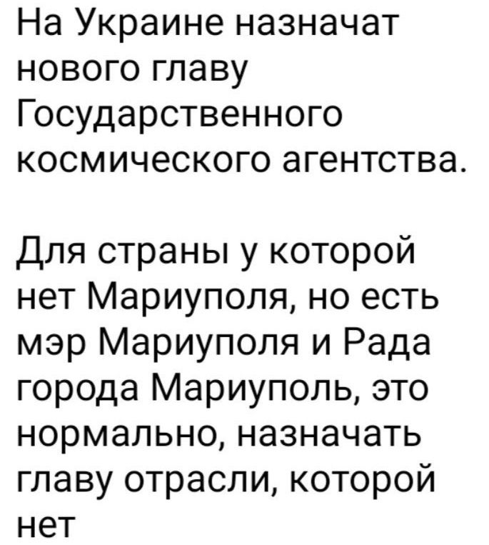 На Украине назначат нового главу Государственного космического агентства Для страны у которой нет Мариуполя но есть мэр Мариуполя и Рада города Мариуполь это нормально назначать главу отрасли которой нет