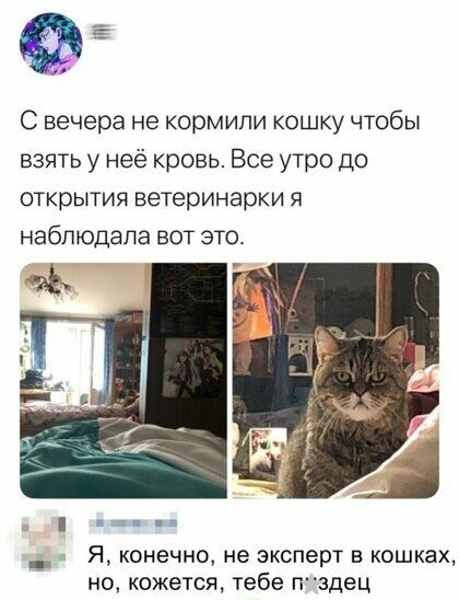 1 С вечера не кормили кошку чтобы взять у неё кровь Все утро до открытия ветеринарки наблюдала вот это _ Я конечно не эксперт в кошках но кажется тебе пвдец