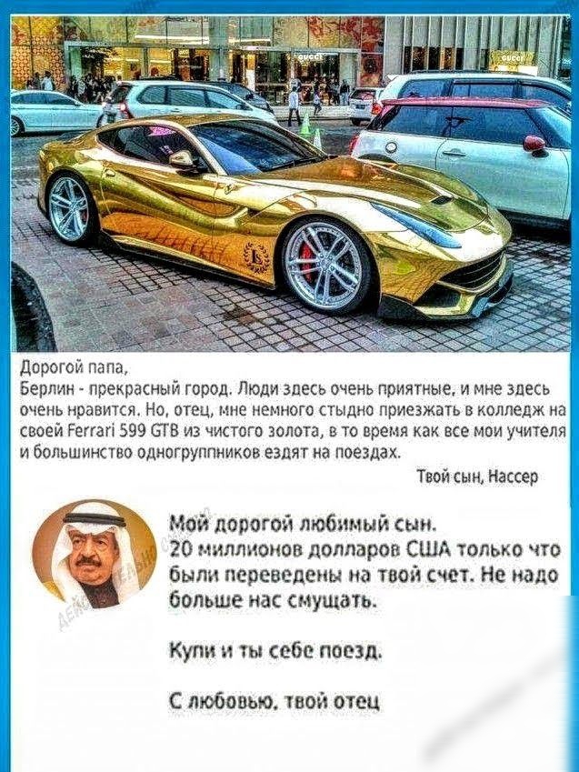 дорогои папа Берлин Прекрасный ГОРОД ЛЮДИ ЗДЕСЬ ОЧЕНЬ приятные И мне ЗДЕСЬ ОЧЕНЬ НрдВИТСЯ НО ОТЕЦ мне НЕМНОГО СТЫДНО приезжать В колледж на своеи Реггагі 599 СГБ из чистого золота в то время как все мои учителя и большинство одногруппников ездят на поездах Твой сын Нассер Мой дорогой любимый сип 20 миллионов доппзров США толъко что были переведены на твой счет Не надо больше на смущать Купи и ты с