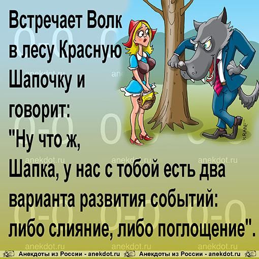 Встречает Волк _ _ в лесу Красную 7 Шапочку и говорит Ну что ж Шапка у нас с тобой есть два варианта развития событий либо слияние либо поглощение