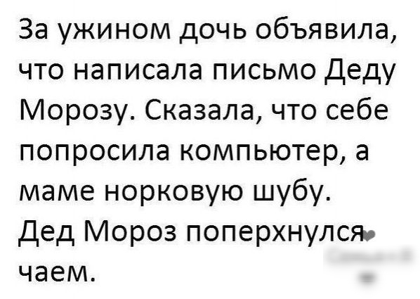 За ужином дочь объявила что написала письмо Деду Морозу Сказала что себе попросила компьютер а маме норковую шубу Дед Мороз поперхнулся чаем