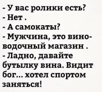 У вас ролики есть Нет А самокаты Мужчина это вино водочный магазин Ладно давайте бутылку вина Видит бог хотел спортом заняться