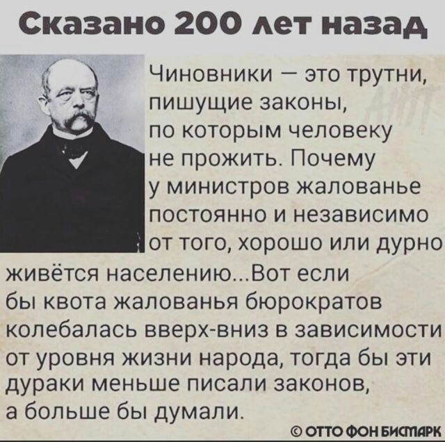 Сказано 200 лет назад Чиновники это трутни пишущие законы по которым человеку не прожить Почему у министров жалованье постоянно и независимо от того хорошо или дурно живётся населениюВот если бы квота жалованья бюрократов колебалась вверхвниз в зависимости ОТ уровня ЖИЗНИ народа тогда бЫ ЭТИ дураки меньше ПИСЭЛИ ЗЭКОНОВ а больше бы думали ОТТО ФОН БИПТЮК