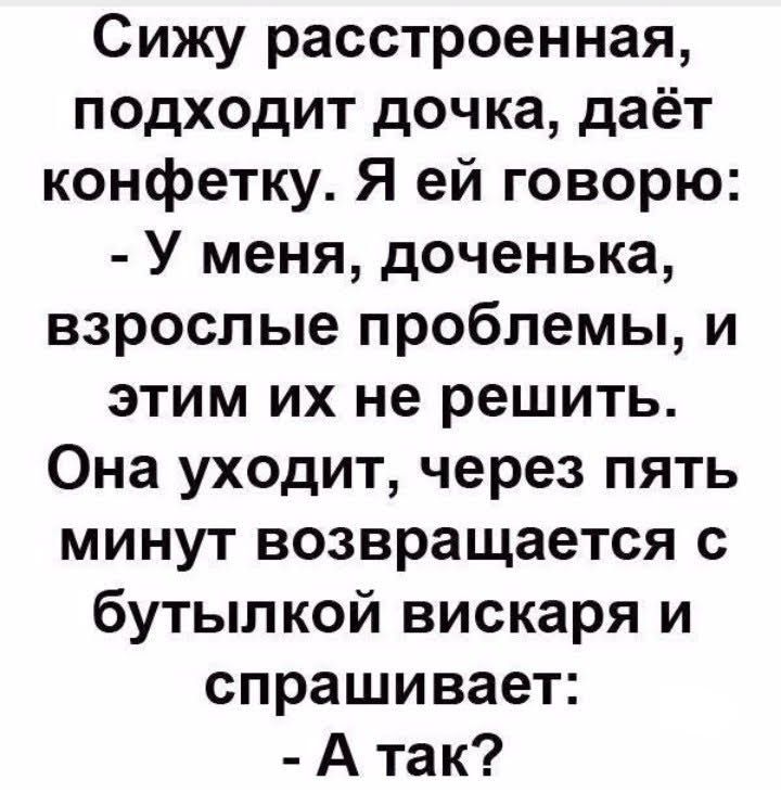 Сижу расстроенная подходит дочка даёт конфетку Я ей говорю У меня доченька взрослые проблемы и этим их не решить Она уходит через пять минут возвращается с бутылкой вискаря и спрашивает А так