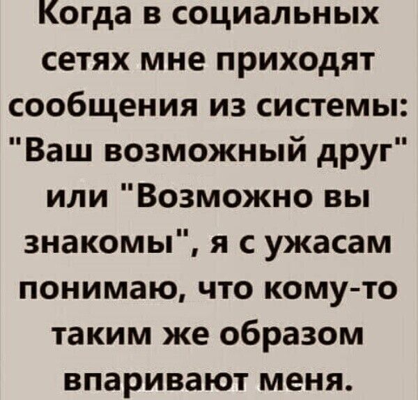 Когда в социальных сетях мне приходят сообщения из системы Ваш возможный друг или Возможно вы знакомы я с ужасам понимаю что кому то таким же образом впаривают меня