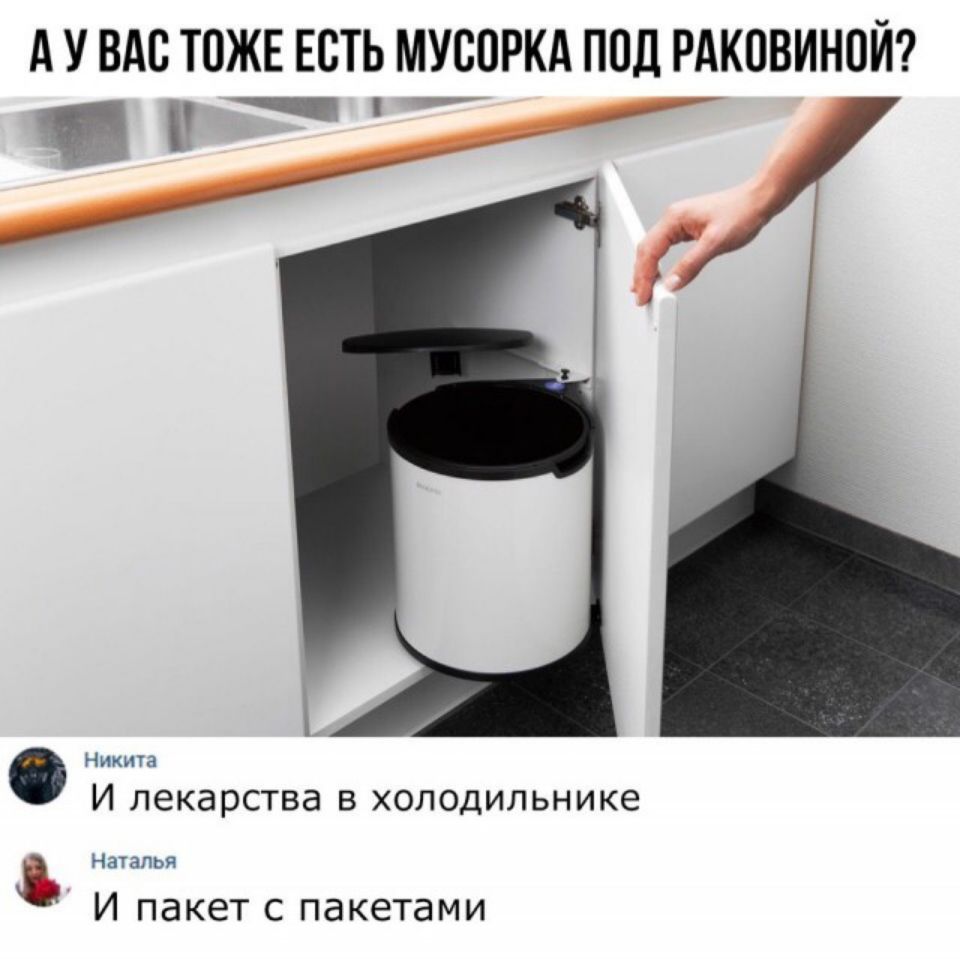 А У ВАС ТОЖЕ ЕСТЬ МУСОРКА ПОД РАКОВИНОЙ мир чччччч О И ЛЕКЭРСТВЭ В ХОЛОДИЛЬНИК6 Н аааааа И ПдКЕТ С пакетами