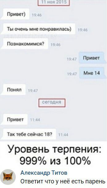 привет Ты очень мне понравилась познакомимся Привет Мне 14 Ппнял приш Так тебе сейчвс 187 Уровень терпения 999 из 100 Александр Титов ответит что у нее есть парень