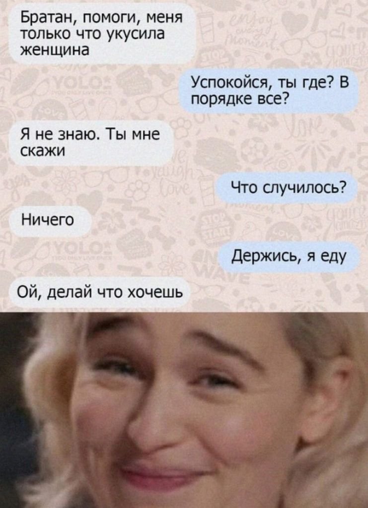 Братан помоги меня только что укусила женщина Успокойся ты где В порядке все Я не знаю Ты мне скажи Что случилось Ничего Держись я еду Ой делай что хочешь