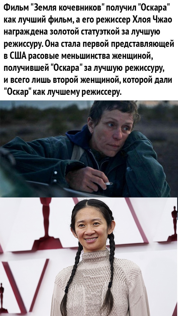 Фильм Земля кочевников получил Оскара как лучший фильм а его режиссер Хлоя Чжао награждена золотой статуэткой за лучшую режиссуру0на стала первой представляющей в США расовые меньшинства женщиной получившей Оскара за лучшую режиссуру и всего лишь второй женщиной которой дали Оска р как лучшему режиссеру