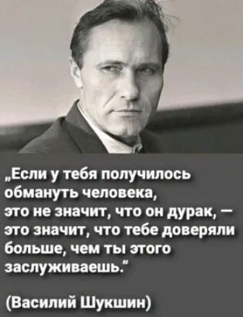 "Если у тебя получилось обмануть человека, это не значит, что он дурак, — это значит, что тебе доверяли больше, чем ты этого заслуживаешь." (Василий Шукшин)