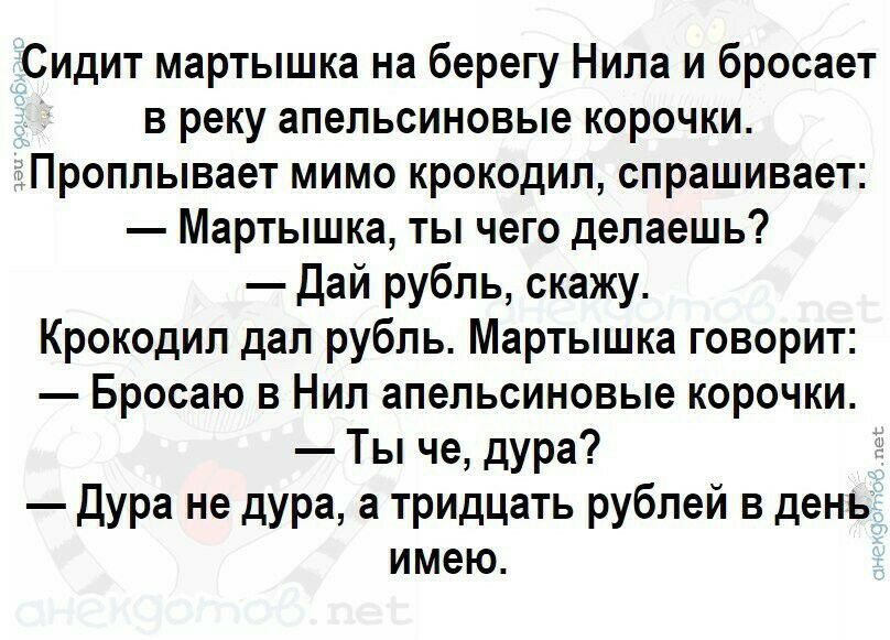 Сидит мартышка на берегу Нила и бросает в реку апельсиновые корочки Проплывает мимо крокодил спрашивает Мартышка ты чего делаешь Дай рубль скажу Крокодил дал рубль Мартышка говорит Бросаю в Нил апельсиновые корочки Ты че дура Дура не дура а тридцать рублей в день имею