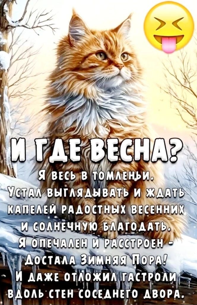 И ГДЕ ВЕСНА? Я весь в томленьи. Устал выглядывать и ждать капель радостных весенних и солнечную благодать. Я опечален и расстроен - достала Зимняя Пора! И даже отложил гастроли вдоль стен соседнего двора.