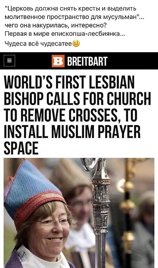 "Церковь должна снять кресты и выделить молитвенное пространство для мусульман"... чего она накуралась, интересно? Первая в мире епископша-лесбиянка... Чудеса всё чудеснее