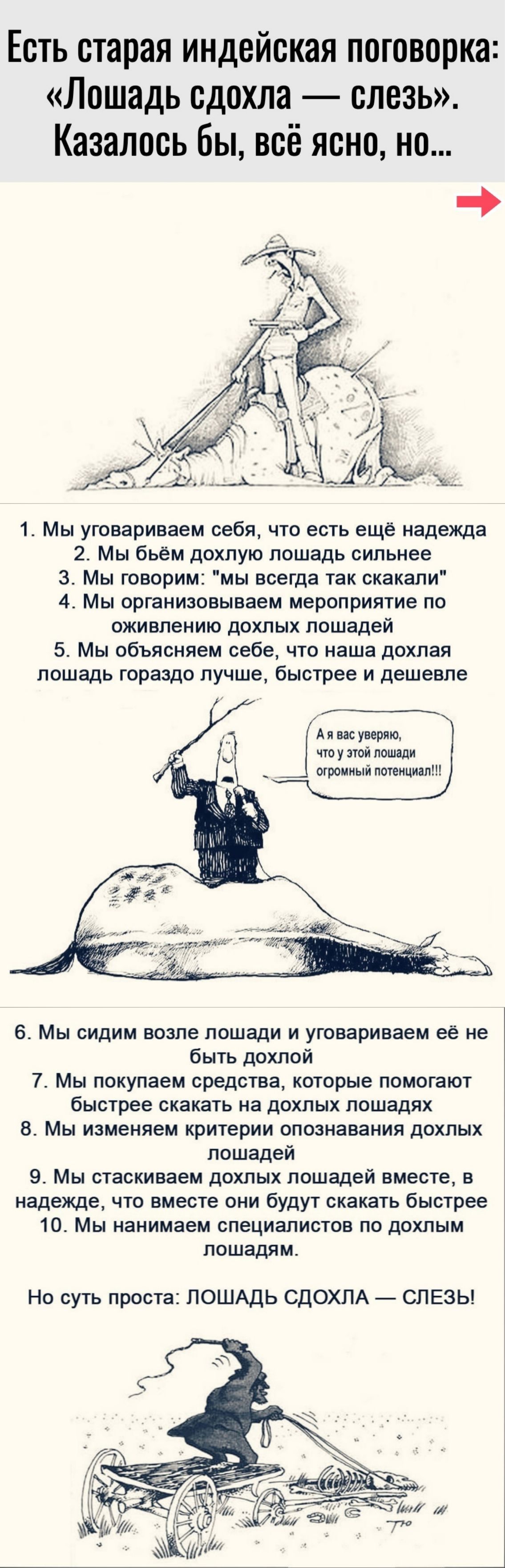 Есть старая индийская поговорка: «Лошадь сдохла — слезы». Казалось бы, всё ясно, но... 1. Мы уговариваем себя, что есть ещё надежда 2. Мы бьём дохлую лошадь сильнее 3. Мы говорим: "мы всегда так скакали" 4. Мы организовываем мероприятие по оживлению дохлых лошадей 5. Мы объясняем себе, что наша дохлая лошадь гораздо лучше, быстрее и дешевле 6. Мы сидим возле лошади и уговариваем её не быть дохлой 7. Мы покупаем средства, которые помогают быстрее скакать на дохлых лошадях 8. Мы изменяем критерии опознавания дохлых лошадей 9. МыStacks картина дохлых лошадей вместе, в надежде, что вместе они будут скачет быстрее 10. Мы нанимаем специалистов по дохлым лошадям. Но суть проста: ЛОШАДЬ СДОХЛА — СЛЕЗЬ!
