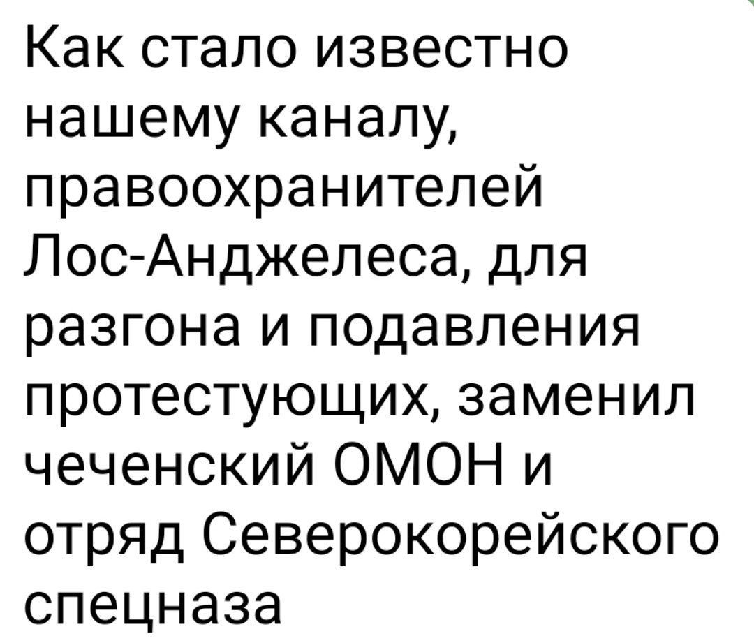 Как стало известно нашему каналу, правоохранителей Лос-Анджелеса, для разгона и подавления протестующих, заменил чеченский ОМОН и отряд Северокорейского спецназа