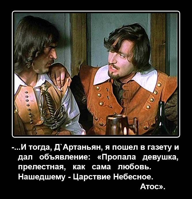 "...И тогда, Д'Артаньян, я пошёл в газету и дал объявление: «Пропала девушка, прелестная, как сама любовь. Нашедшему - Царствие Небесное. Атос».