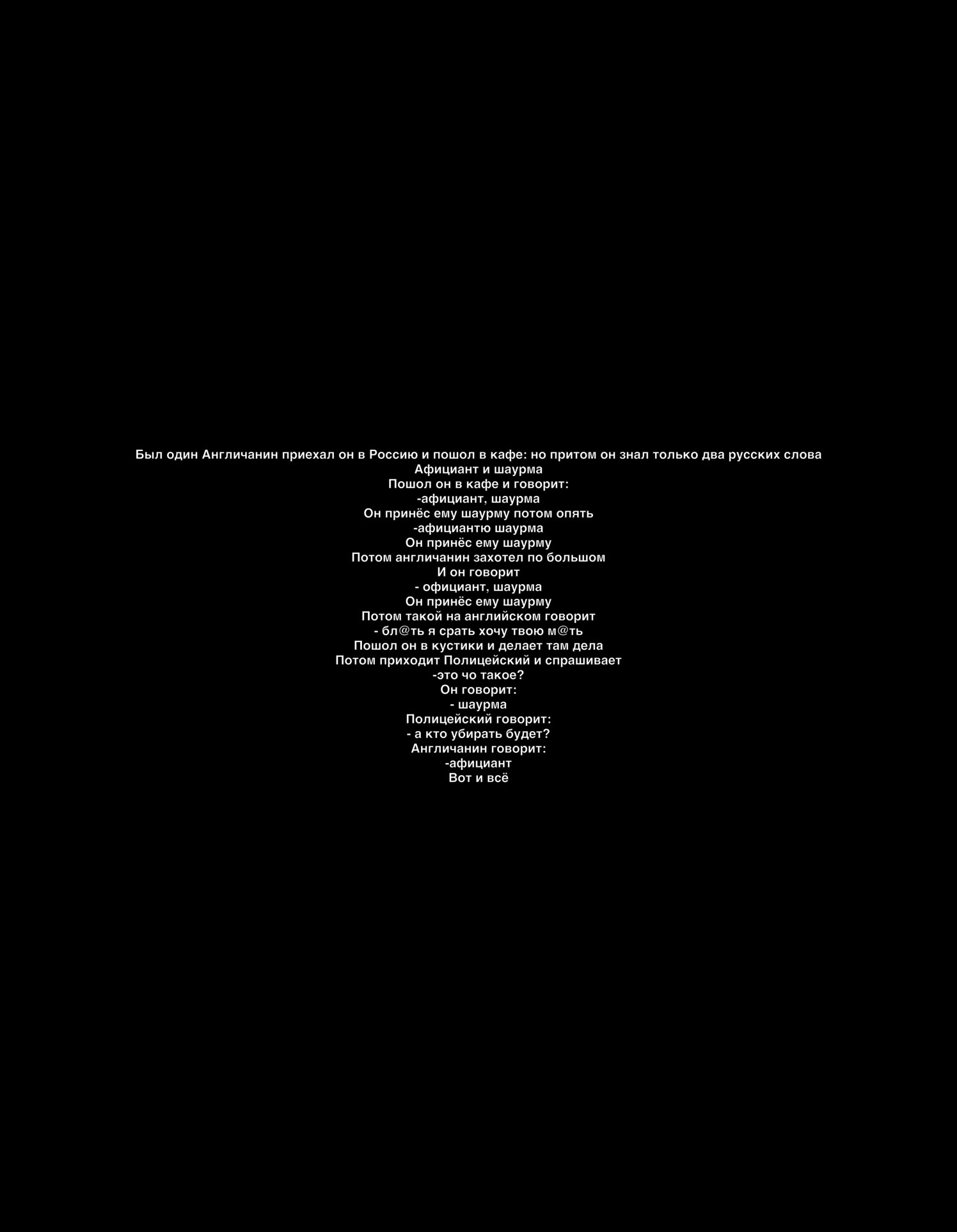 Был один Англичанин приехал он в Россию и пошоп в кафе но притом он знал только два русских слова Афициант и шаурма Пошоп он в кафе и говорит афициант шаурма Он принёс ему шаурму потом опять афициантю шаурма Он принёс ему шаурму Потом англичанин захотел по большом И он говорит официант шаурма Он принёс ему шаурму Потом такой на английском говорит бпть я срать хочу твою мть Пошол он в кустики и дел