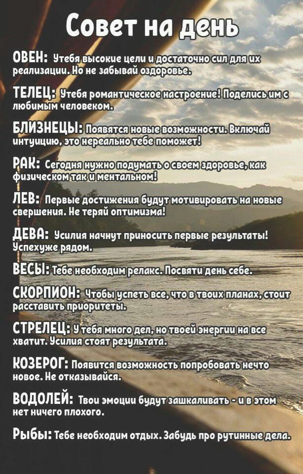 Совет на день ОВЕН тебтысокие цепи и достаточно сил для 53 реализации Но не абывай видом и ТЕЛЕЦ тсбя романтическое 6 любимым ценником БЛИЗНЕЦЫ Появптци интуицию это иди сегщия_о_пш физическом_ свершения тории оптимизма дЕвд Чсипия начнут приносить первые риильмты Вхіспехиже рядом СТРЕЛЕЦ теб его 0 тонн энирги хватит Метшин рвзильтата о боиатьнечто ВОДОЛЕЙ Твои эмоции будут зашкаливать нет ничего