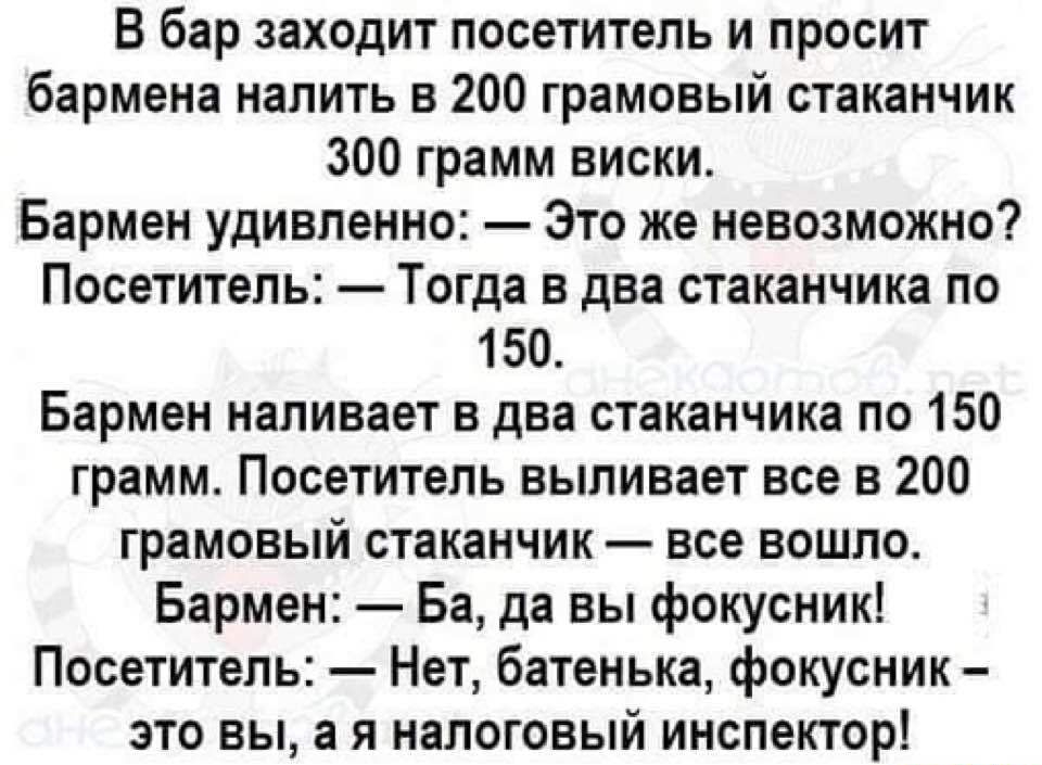 В бар заходит посетитель и просит бармена налить в 200 грамовый стаканчик 300 грамм виски Бармен удивленно Это же невозможно Посетитель Тогда в два стаканчика по 150 Бармен наливает в два стаканчика по 150 грамм Посетитель выливает все в 200 грамовый стаканчик все вошло Бармен Ба да вы фокусник Посетитель Нет батенька фокусник это вы а я налоговый инспектор