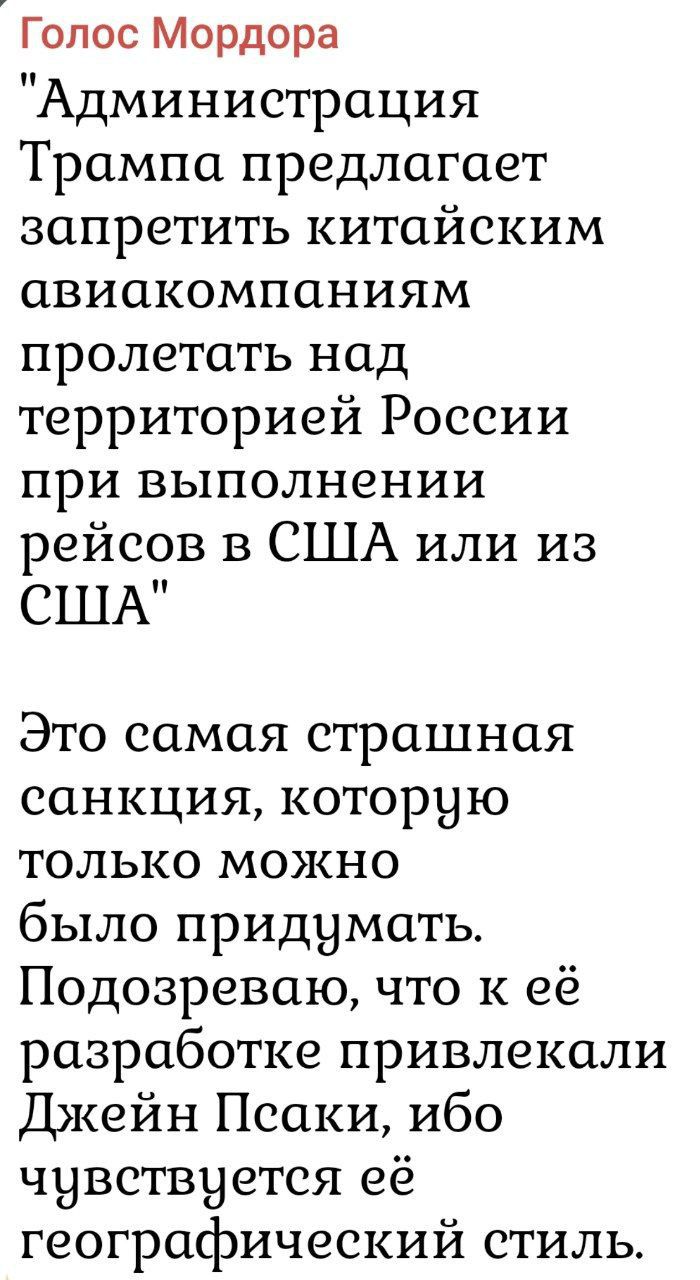 "Администрация Трампа предлагает запретить китайским авиакомпаниям пролетать над территорией России при выполнении рейсов в США или из США" Это самая страшная санкция, которую только можно было придумать. Подозреваю, что к её разработке привлекали Джейн Псаки, ибо чувствуется её географический стиль.