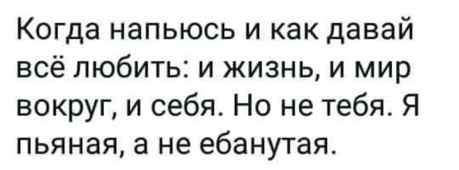 Когда напьюсь и как давай всё любить и жизнь и мир вокруг и себя Но не тебя Я пьяная а не ебанутая