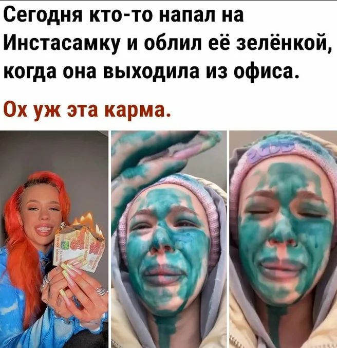 Сегодня кто то напал на Инстасамку и облил её зелёнкой когда она выходила из офиса Ох уж эта карма