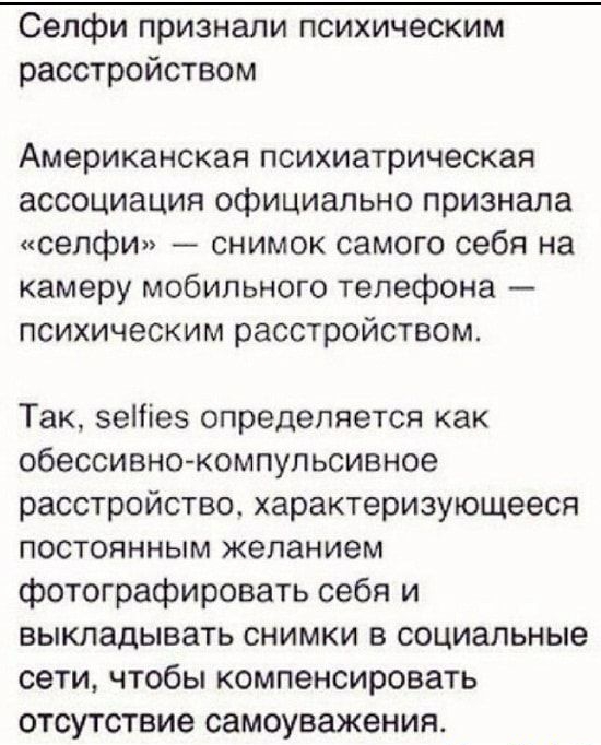 Сепфи признали психическим расстройством Американская психиатрическая ассоциация официально признала селфи снимок самого себя на камеру мобильного телефона психическим расстройством Так зетез определяется как обессивно компульсиеное расстройство характеризующееся постоянным желанием фотографировать себя и выкладывать снимки в социальные сети чтобы компенсировать отсутствие самоуважения