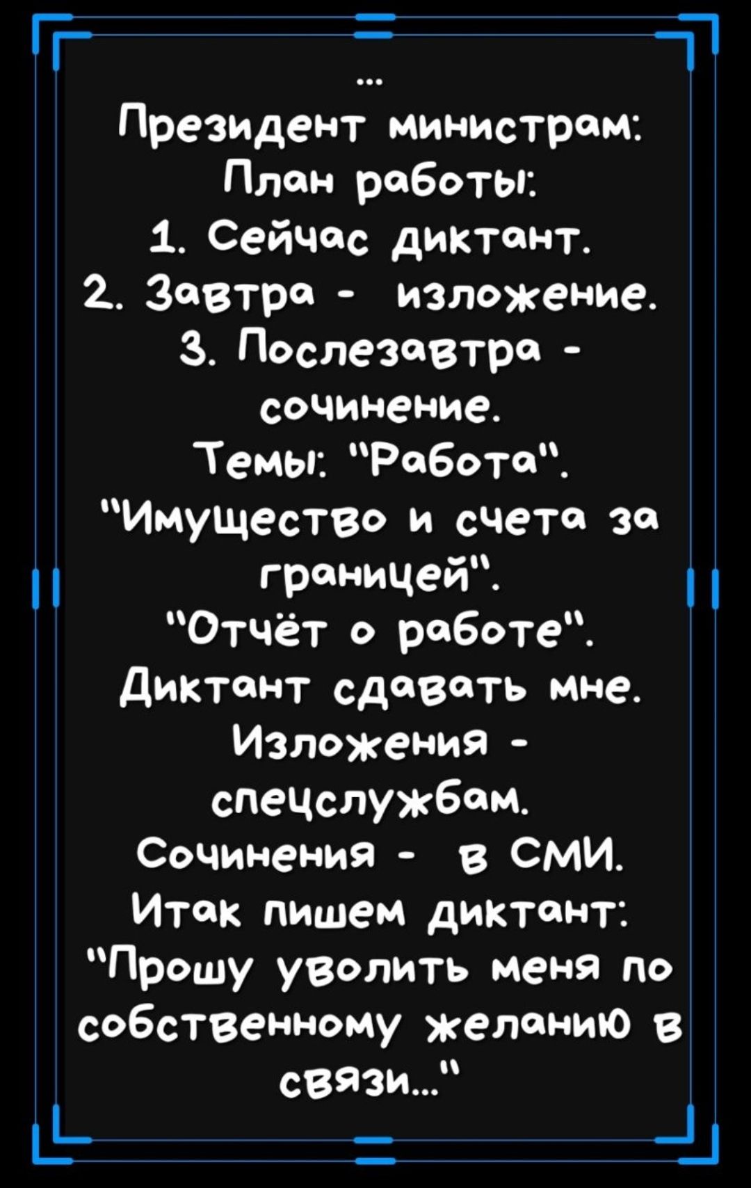 гг 1 Президент министрам План работы 1 Сейччс диктант 2 Завтрак изложение з Послезавтра сочинение Темы Работа Имущество и счета за гттчей Отчёт о рпботе_ диктант сдавать мне Изложения спеЦспужбом СоЧимемия в СмИ Итак пишем диктант _ Прошу уволить меня по собственному желанию в связи 11 _1