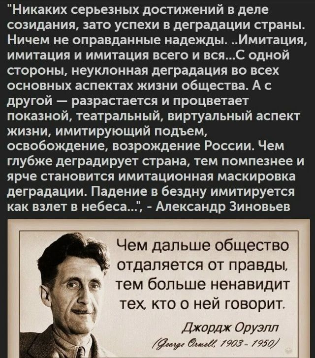 "Никаких серьезных достижений в деле созидания, зато успехи в деградации страны. Ничем не оправданы надежды... Имитация, имитация и имитация всего и вся... С одной стороны, неуклонная деградация во всех основных аспектах жизни общества. А с другой — разрастается и процветает показной, театральный, виртуальный аспект жизни, имитирующий подвиг, освобождение, возрождение России. Чем глубже деградирует страна, тем помпезнее и ярче становятся показы имитации деградации. Падение в бездну имитируется как взлет в небо...", - Александр Зиновьев Джордж Оруэлл (George Orwell, 1903 - 1950)
