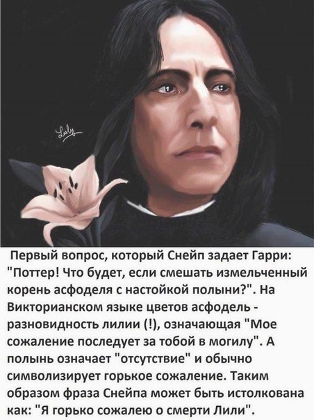Первый вопрос который Снейп задает Гарри Поттер Что будет если смешать измельченный корень асфоделя настойкой полыни На Викторианском языке цветов асФодель разновидность лилии означающая Мое сожаление последует за тобой в могилу А полынь означает отсутствие и обычно символизирует горькое сожаление Таким образом Фраза Снейпа может быть истолкована как Я горько сожалею о смерти Лили