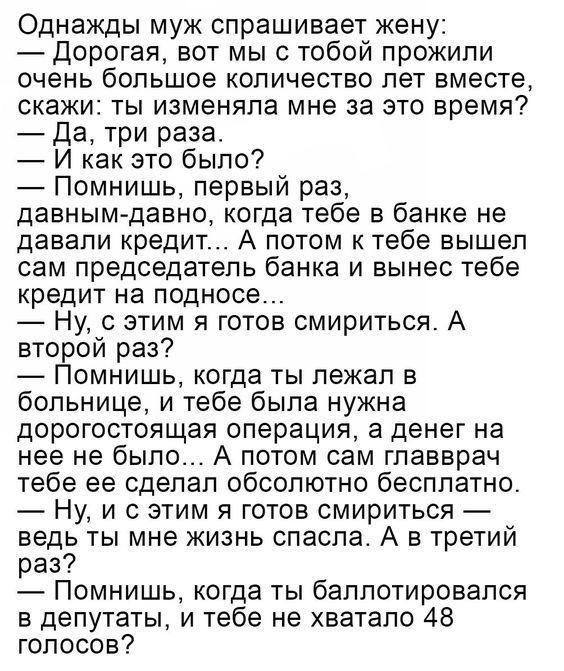Однажды муж спрашивает жену Дорогая вот мы с тобой прожили очень большое количество лет вместе скажи ты изменяла мне за это время Да три раза И как это было Помнишь первый раз давным давно когда тебе в банке не давали кредит А потом к тебе вышел сам председатель банка и вынес тебе кредит на подносе Ну с этим я готов смириться А второй раз Помнишь когда ты лежал в больнице и тебе была нужна дорогос