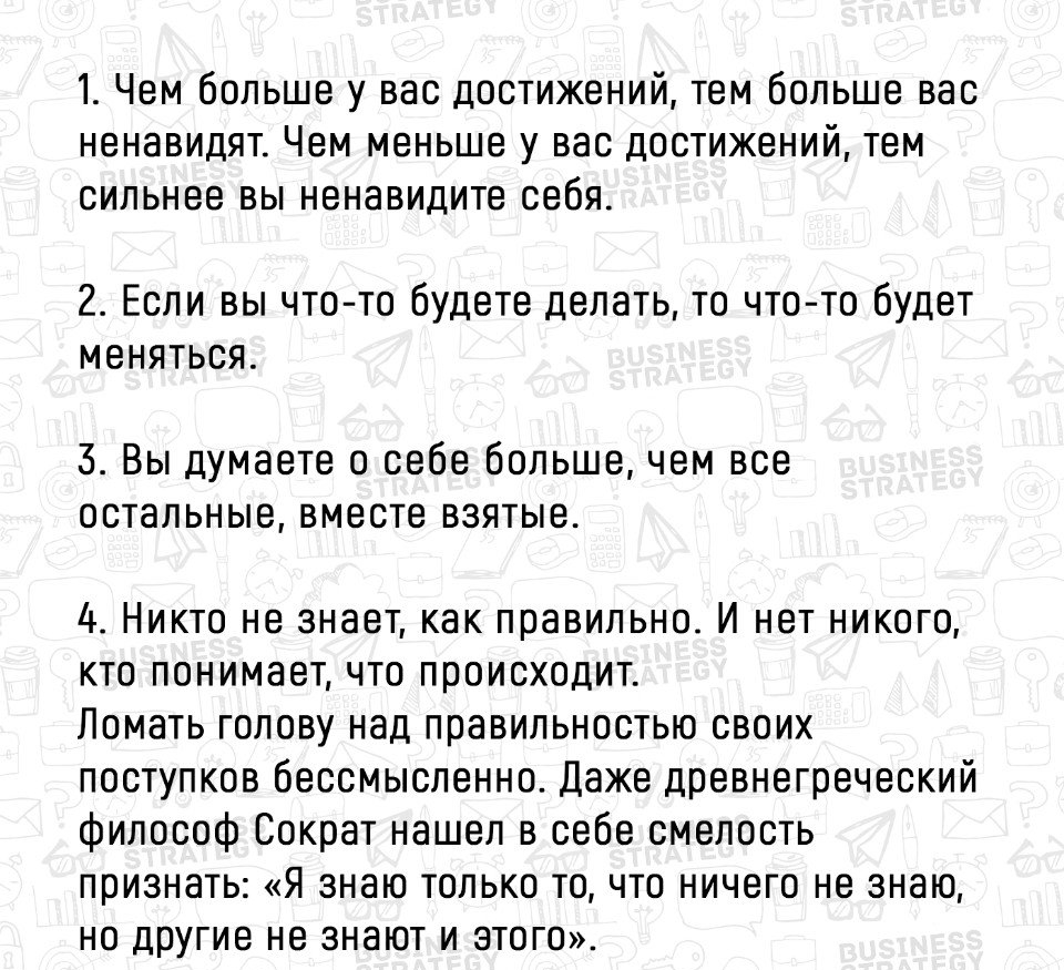 1 Чем больше у вас достижений тем больше вас ненавидят Чем меньше у вас достижений тем сильнее вы ненавидите себя 2 Если вы что то будете делать то что то будет меняться 3 Вы думаете о себе больше чем все остальные вместе взятые 4 Никто не знает как правильно И нет никого кто понимаетчто происходит Ломать голову над правильностью своих поступков бессмысленно Даже древнегреческий философ Сократ наш