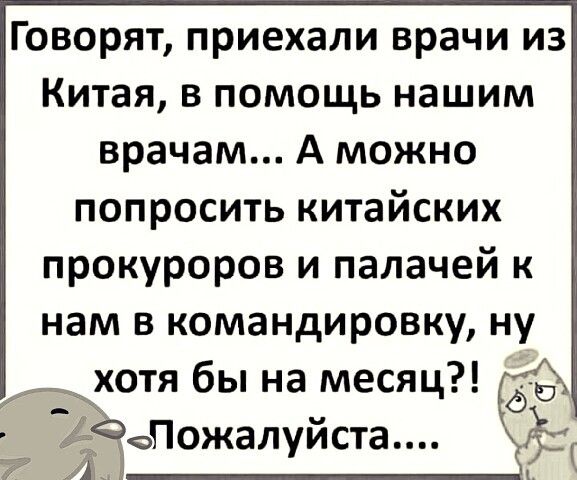 Говорят приехали врачи из Китая в помощь нашим врачам А можно попросить китайских прокуроров и палачей к нам в командировку ну хотя бы на месяц _ Л0жал йста