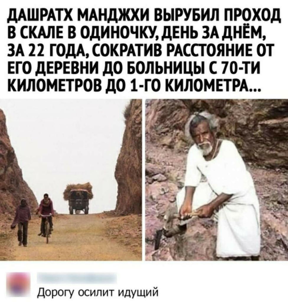 ДАШРАТХ МАНДЖХИ ВЫРУБИЛ ПРОХОД В СКАЛЕ В ОДИНОЧКУ ДЕНЬ ЗА ДНЁМ ЗА 22 ГОДА СОКРАТИВ РАССТОЯНИЕ ОТ ЕГО ДЕРЕВНИ ДО БОЛЬНИЦЫ С 7О ТИ КИЛОМЕТРОВ ДО 1 ГО КИЛОМЕТРА и _ Дорогу осилит идущий