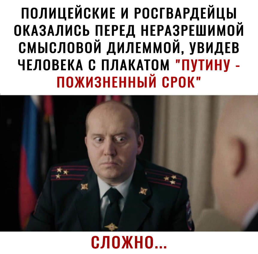 ПОЛИЦЕЙСКИЕ И РОСГВАРДЕЙЦЫ_ ОКАЗАЛИСЬ ПЕРЕД НЕРАСЁРЕШИМОИ СМЫСЛОВОИ ДИЛЕММОИ УВИДЕВ ЧЕЛОВЕКА С ПЛАКАТРМ ПУТИНУ ПОЖИЗНЕННЫИ СРОК