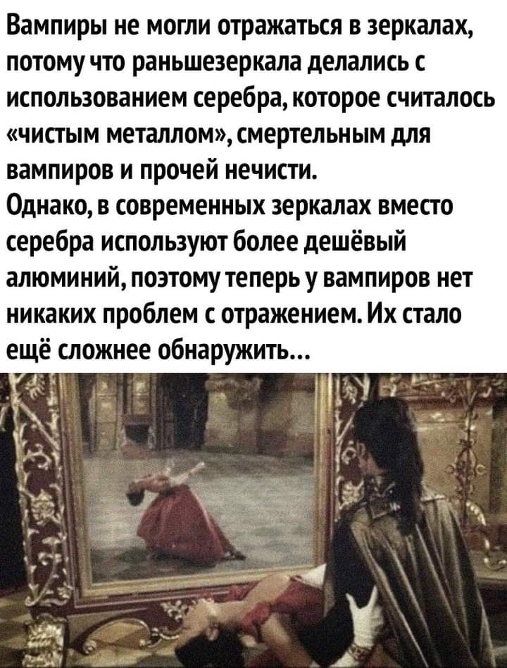 Вампиры не могли отражаться в зеркалах потому что раньшезеркала делались с использованием серебра которое считалось чистым металлом смертельным для вампиров и прочей нечисти Однако в современных зеркалах вместо серебра используют более дешёвый алюминий поэтому теперь у вампиров нет никаких проблем с отражением Их стало ещё сложнее обнаружить
